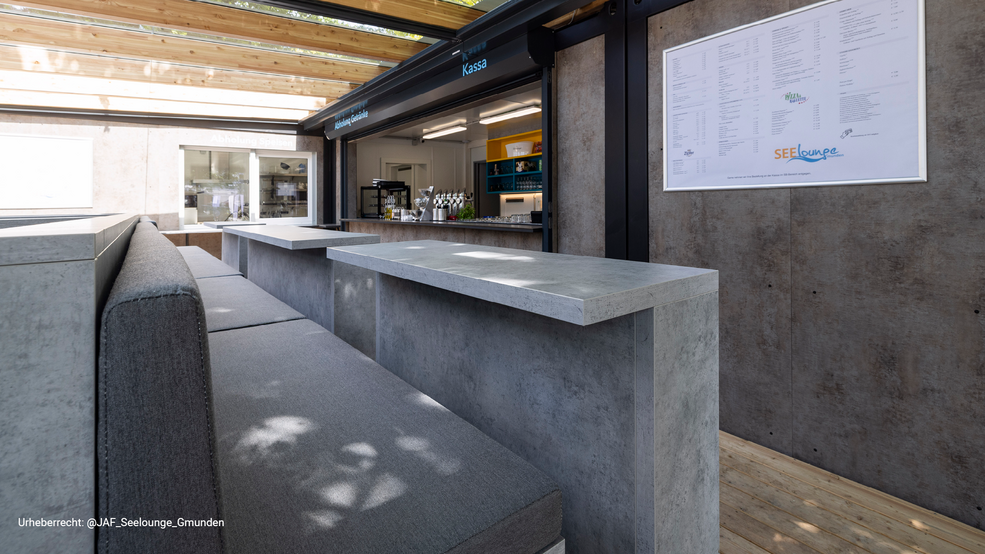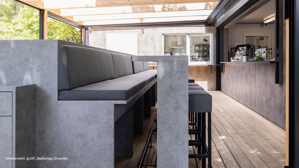 Die Seelounge in Gmunden ist ein Ort der Entspannung mit direktem Blick auf den Traunsee – modern, einladend und mit natürlichem Flair gestaltet. Für das Projekt setzte JAF Salzburg auf eine Kombination hochwertiger Materialien, darunter Massivholz, Schichtstoffplatten und den feuchtebeständigen Funktionswerkstoff purenit®.