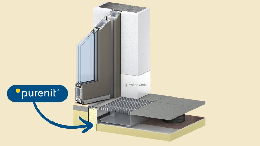 Bei bodentiefen Fenstern entkoppelt purenit den Rahmen von der Bodenplatte, verhindert Wärmeverluste und erhöht die Langlebigkeit des Anschlusses.